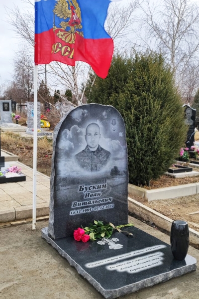 Памятник ростовой из карельского гранита с крупноформатной печатью. Вертикальная гранитная плита выполнена в классической прямоугольной форме. Памятник изготовлен для героя СВО по индивидуальному заказу. Закрытое надгробие имеет правильную прямоугольную форму, ровную сплошную поверхность без дополнительных элементов, что значительно упрощает уход за ритуальным изделием. Размеры памятника и соотношение объемов стелы к надгробию проработаны специалистами с учетом имеющейся нагрузки и визуального восприятия. Такой подход гарантирует долговечность и исключает искажения памятника.