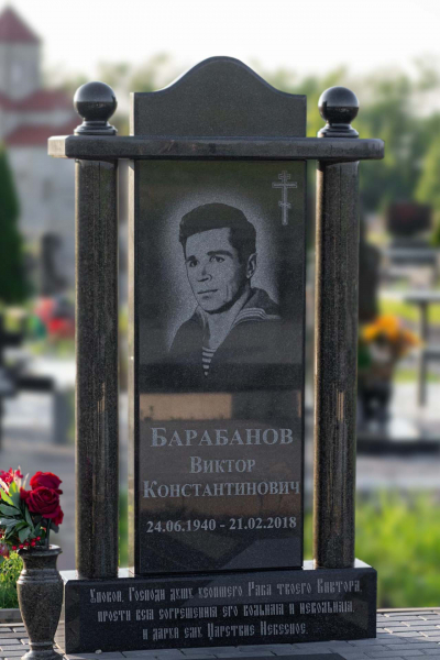 Христианский памятник с колоннами выглядит сдержанно и в то же время необычно. Такое ритуальное изделие будет привлекать к себе внимание и позволит достойно выразить дань уважения покойному. Памятник состоит из вертикальной стелы черного насыщенного цвета с изогнутым верхом, двух симметричных колонн в классическом стиле по бокам плиты и вазы у основания. Закрытое лаконичное надгробие отлично дополняет другие составляющие ритуального изделия и придает ему практичности, ведь за таким памятником не потребуется особый уход. Формы и размеры ритуального изделия проработаны в соответствии с имеющейся нагрузкой и грунтом на выбранном кладбище, что гарантирует памятнику долговечность и исключает возможные искажения.
