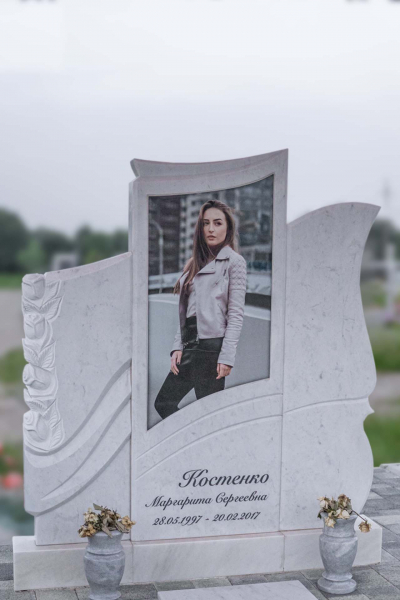 Ассиметричный фрезерный памятник с широкой стелой и закрытым надгробием. Ритуальное изделие выполнено в светлых оттенках и отличается эксклюзивным дизайном стелы. Вертикальная плита визуально разделена на три части и сочетает в себе легкость ассиметричных линий и фрезерные элементы в виде цветов. С помощью фрезеровки в камне высекаются углубления по заданным макетам, придавая памятнику объем, позволяя комбинировать различные элементы и создавать сложные фигуры. Закрытое надгробие упрощает уход за ритуальным изделием и позволяет расположить эпитафию, сделав на ней акцент. Размеры памятника и соотношение объемов стелы к надгробию проработаны специалистами с учетом имеющейся нагрузки и визуального восприятия. Такой подход гарантирует долговечность и исключает искажения памятника.