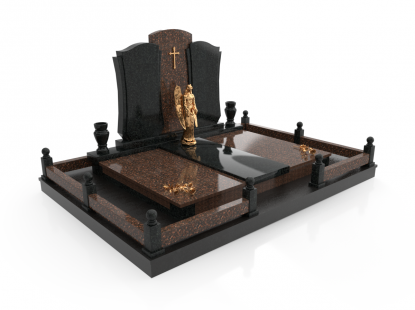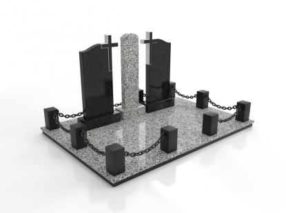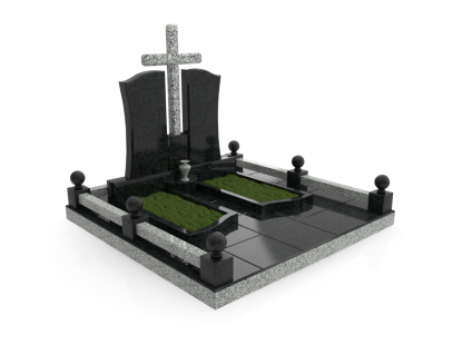Ассиметричный памятник с крестом и колоннами. Ритуальное изделие имеет ассиметричную форму и состоит из нескольких частей, создающих единый монумент. Оригинальное сочетание составляющих памятника придает ему эксклюзивность и выделяет на фоне остальных изделий. Гранитный крест возвышается над прямоугольной стелой и двумя колоннами, приковывая к себе внимание. Колонны по обе стороны стелы имеют разную высоту и изображения креста и свечи. Размеры памятника и соотношение объемов его составляющих проработаны специалистами с учетом имеющейся нагрузки и визуального восприятия. Такой подход гарантирует долговечность и исключает искажения памятника.