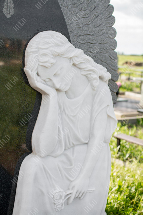 Памятник фрезерный с фигурой ангела и открытым надгробием. Использование фрезеровки в изготовлении ритуальных изделий гарантирует высочайшую точность исполнения запланированного дизайна. С помощью этой технологии в камне высекаются углубления по заданным макетам, придавая памятнику объем, позволяя комбинировать различные элементы и создавать сложные фигуры. На фрезерованном памятнике удачно контрастируют цвета и в солнечную погоду играют тени от объемных деталей. Размеры стелы и надгробия соответствуют заданным нормам при имеющейся нагрузке и исключают деформации изделия со временем.