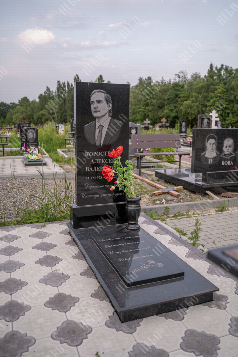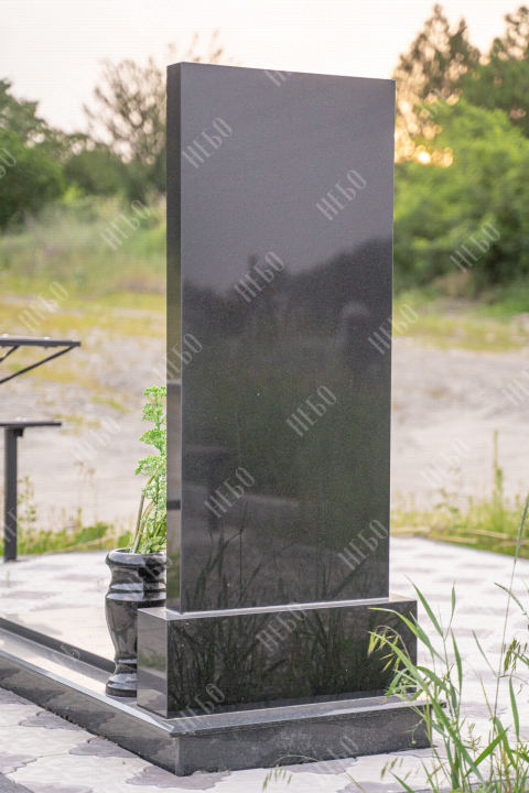 Памятник без креста с прямой стелой, вазой и закрытым надгробием выполнен в лаконичном черном цвете. Вертикальная гранитная плита изготовлена с использованием ассиметричных линий в дизайне памятника, что придает ритуальному изделию индивидуальность. Закрытое надгробие имеет правильную прямоугольную форму, ровную сплошную поверхность без дополнительных элементов, что значительно упрощает уход за ритуальным изделием. Размеры памятника и соотношение объемов стелы к надгробию проработаны специалистами с учетом имеющейся нагрузки и визуального восприятия. Такой подход гарантирует долговечность и исключает искажения памятника.